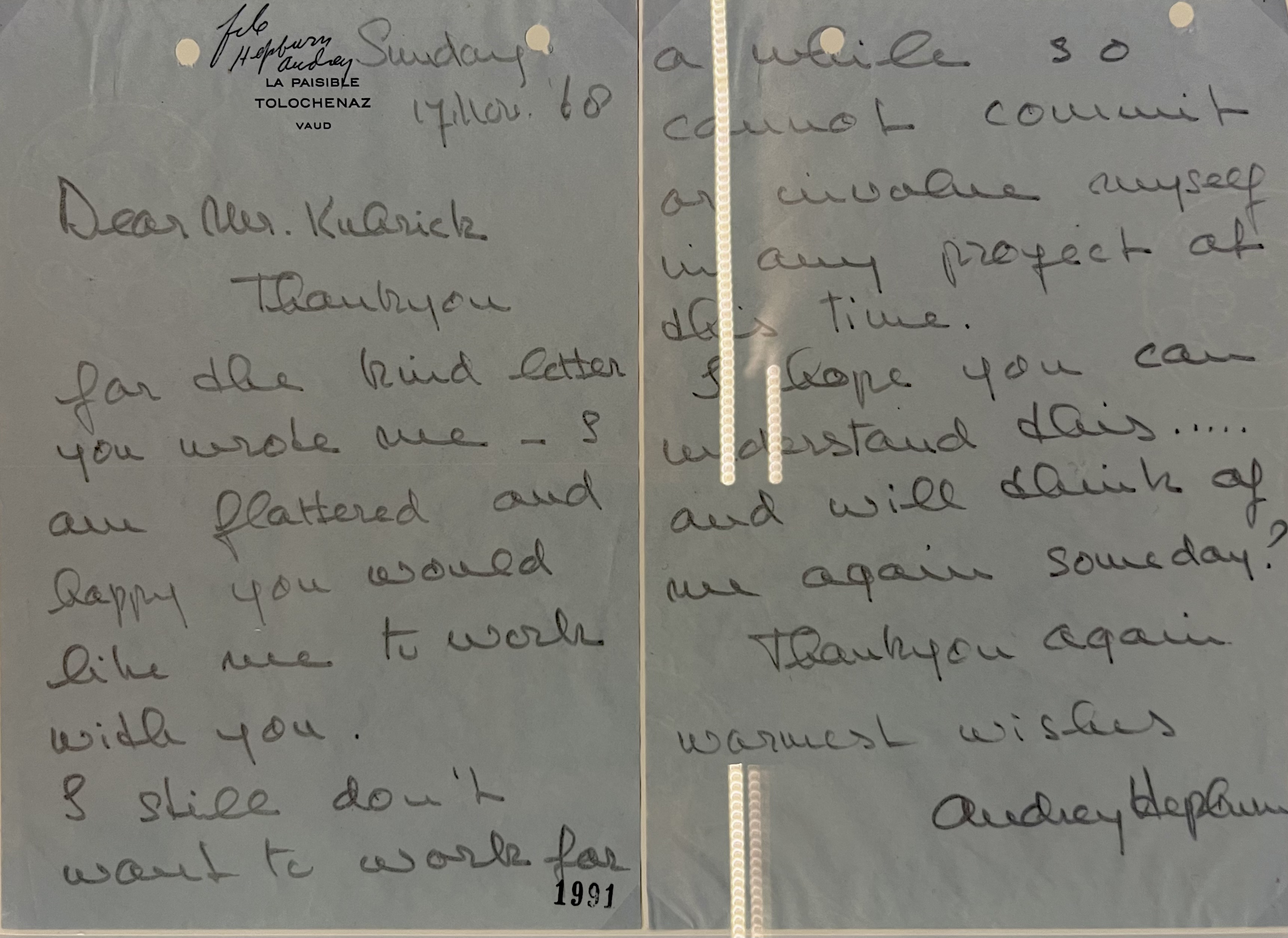 Bahsetmeden geçemeyeceğimiz bir diğer filmi ise dönemi için oldukça cüretkâr kalan “Lolita”. Üzerinde el yazısı notlarını gördüğümüz senaryo kopyalarından, kiliselerden gelen tehdit mektuplarına kadar serginin en ilgi çekici kısımlarından. Başrolü üstlenen ve bu filmden sonra uzun bir süre oyunculuk yapamayacak kadar karalama ile karşılaşan Shelley Winters’ın oyunculuktan sonraki hayatını anlattığı ancak hiçbir zaman Kubrick’in eline geçmeyen mektubunu okurken buluyoruz kendimizi.