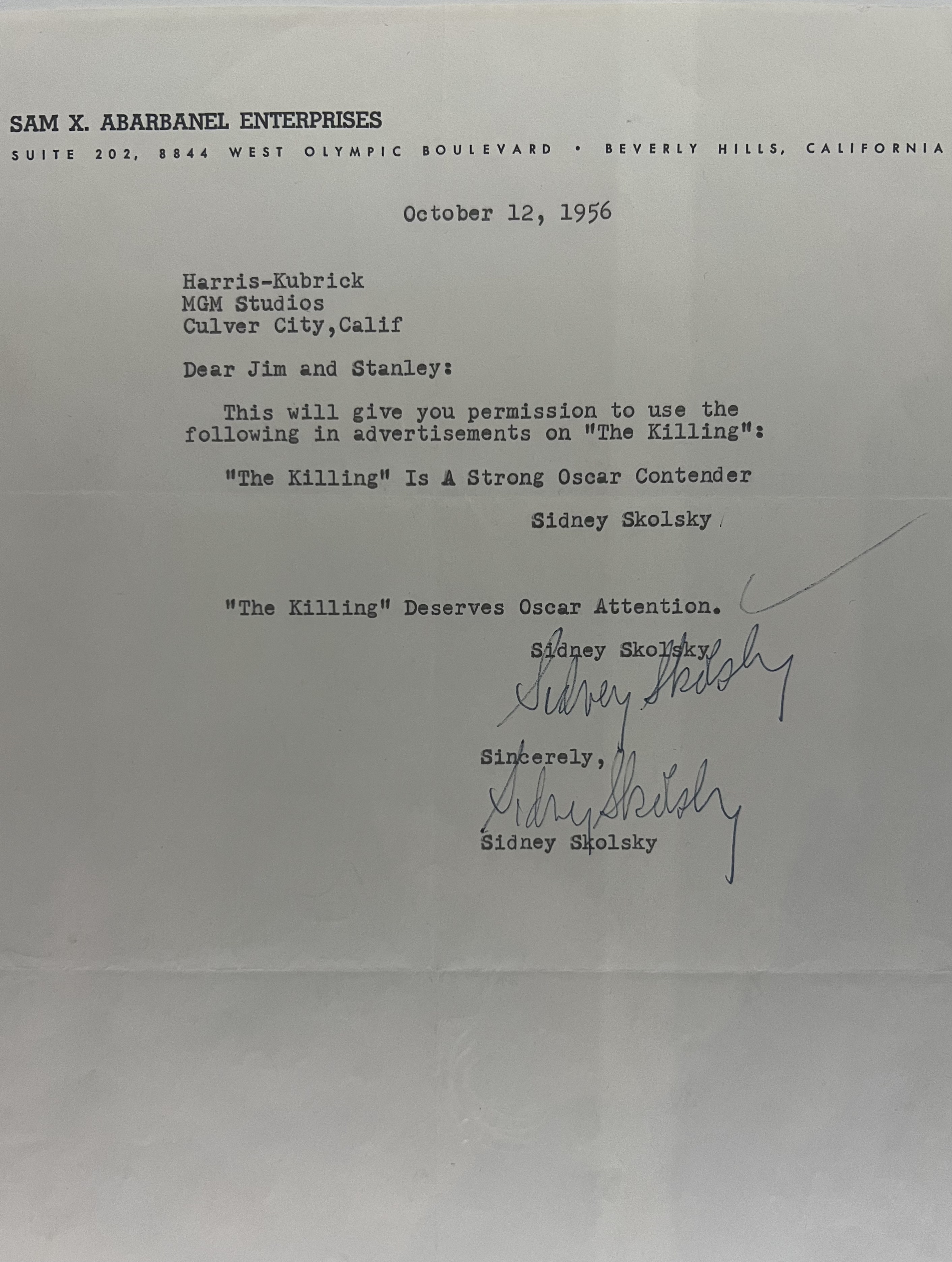 “The Killing” kısmına geldiğimizde de Hollywood’un dedikodu yazarı olarak bilinen Sydney Skolsky’nin filmin Oscar adaylığı hak ettiğini düşündüğünü yazdığı mektupla karşılaşıyoruz. “Paths of Glory”de ise adeta kendi excel çizelgesini oluştuğunu gördüğümüz, sahne ve oyuncu çekim takvimlerini bulunduran geniş bir çekim planı ile karşılaşıyoruz. Fransa’da senelerce yasaklanan bu filmin Fransa için tasarlanan posterini de sergide görmek mümkün. Sonradan dahil olduğu film “Spartacus” bölümünde en etkileyici parça ise başrolü üstlenen Kirk Douglas’ın Kubrick’e yazdığı mektup.
