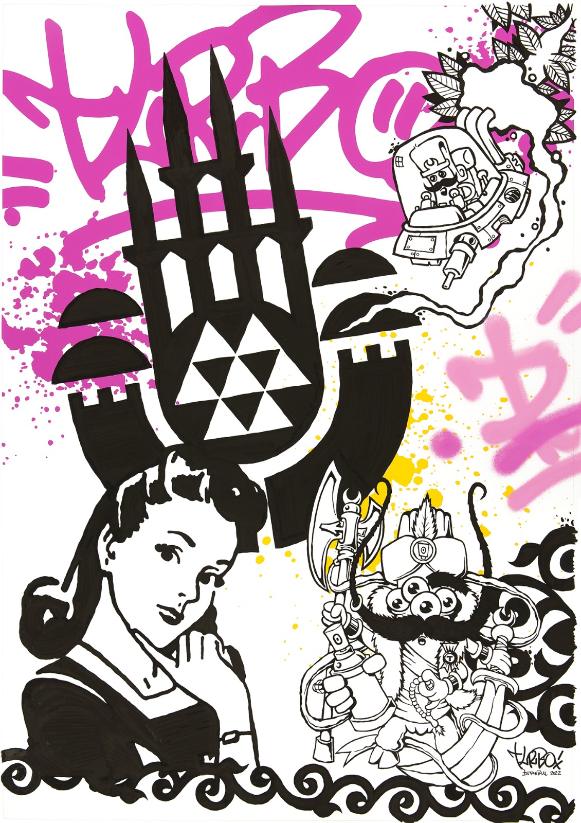 Türkiye’de grafitinin ilk temsilcisi olan Turbo, bu sergisinde İstanbul’un altını üstüne getiriyor. Kenti, sadece toprağın üstündekilerle değil suyun altındakilerle de dillendiriyor.